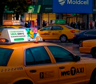 Publicitatea dumneavoastră călătorește prin oraș pe acoperișul unui taxi, sau fereastra troleibuzului asigurând o mișcare continuă a brandului în fața publicului și acoperind noi zone cu fiecare traseu.